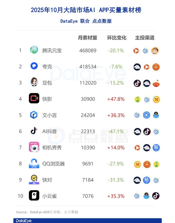 对于当下的拳头AI产品,腾讯尤其加深了对元宝的推广投入。第三方市场调研机构DataEye公布的数据显示,2025年至10月,腾讯元宝AI产品投放素材量(即买量)位列中国大陆AI应用市场Top1,其次是夸克和豆包。不过,在9-10月的iOS端头部AIAPP下载量中,豆包依旧保持领先,腾讯元宝则位列第三位。